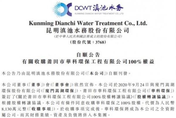 收購完成后,華科環保將成為滇池水務全資附屬公司,而其財務業績、資產及負債將并入滇池水務。