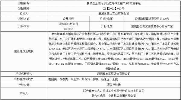 2月10日,河南省襄城縣全域污水處理環保工程二期EPC總承包(不見面開標)-結果公告-****標段發布,中標人為機械工業勘察設計研究院有限公司、中建科工集團有限公司聯合體,工期為24個月。